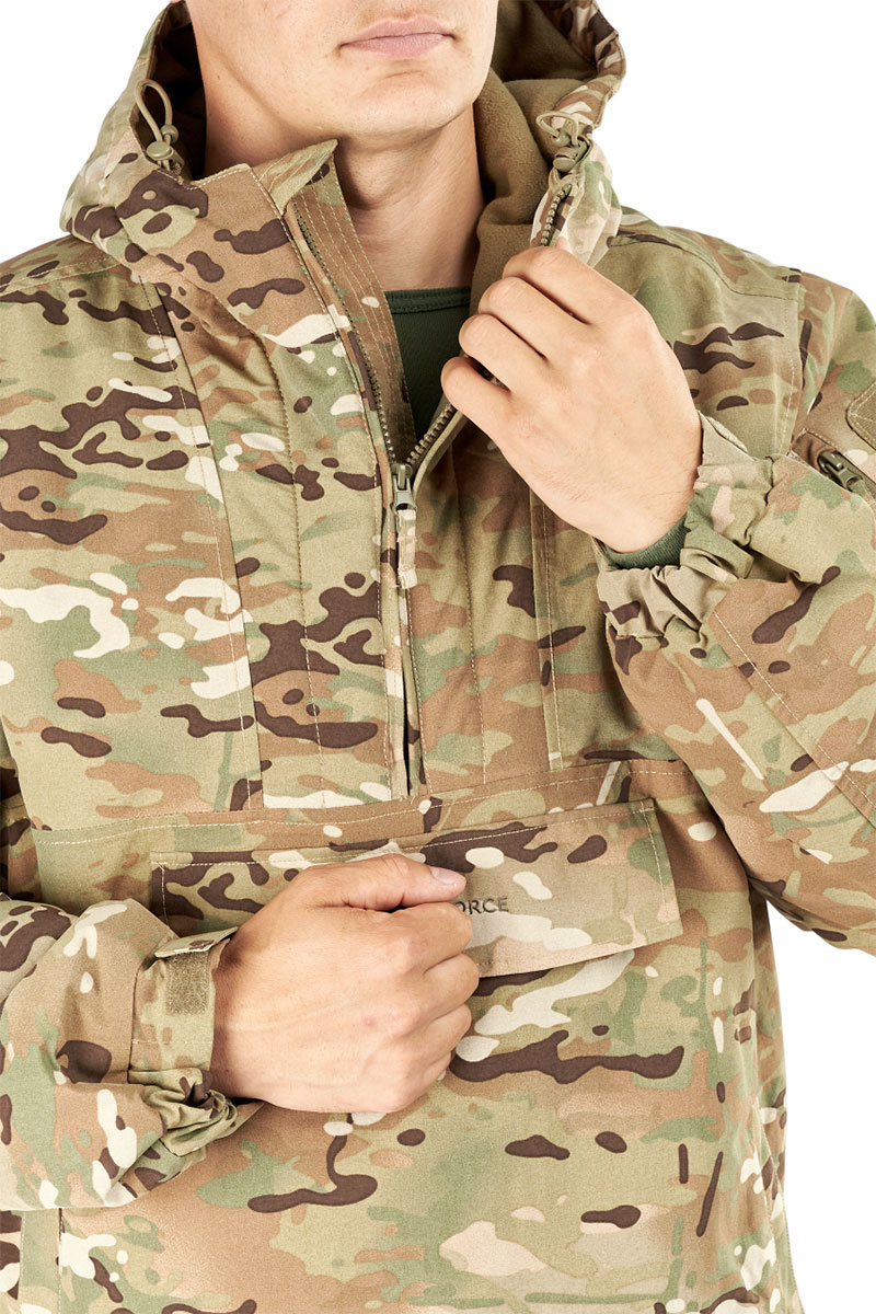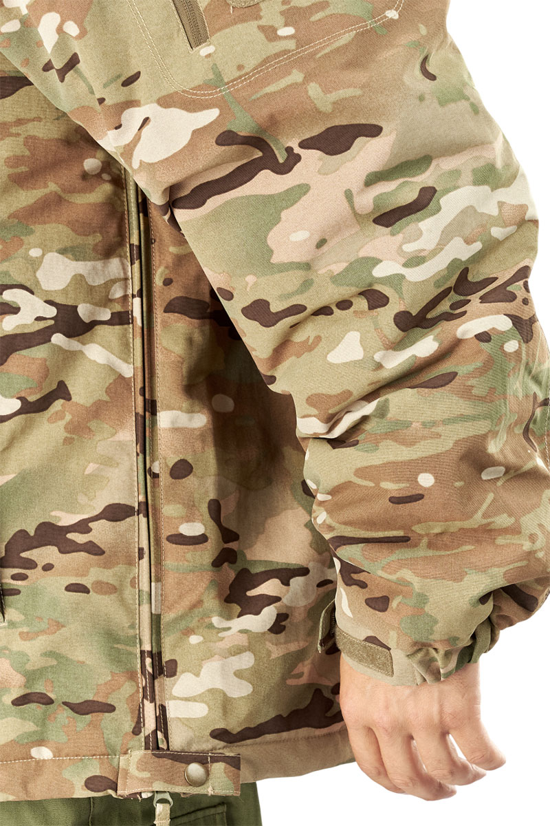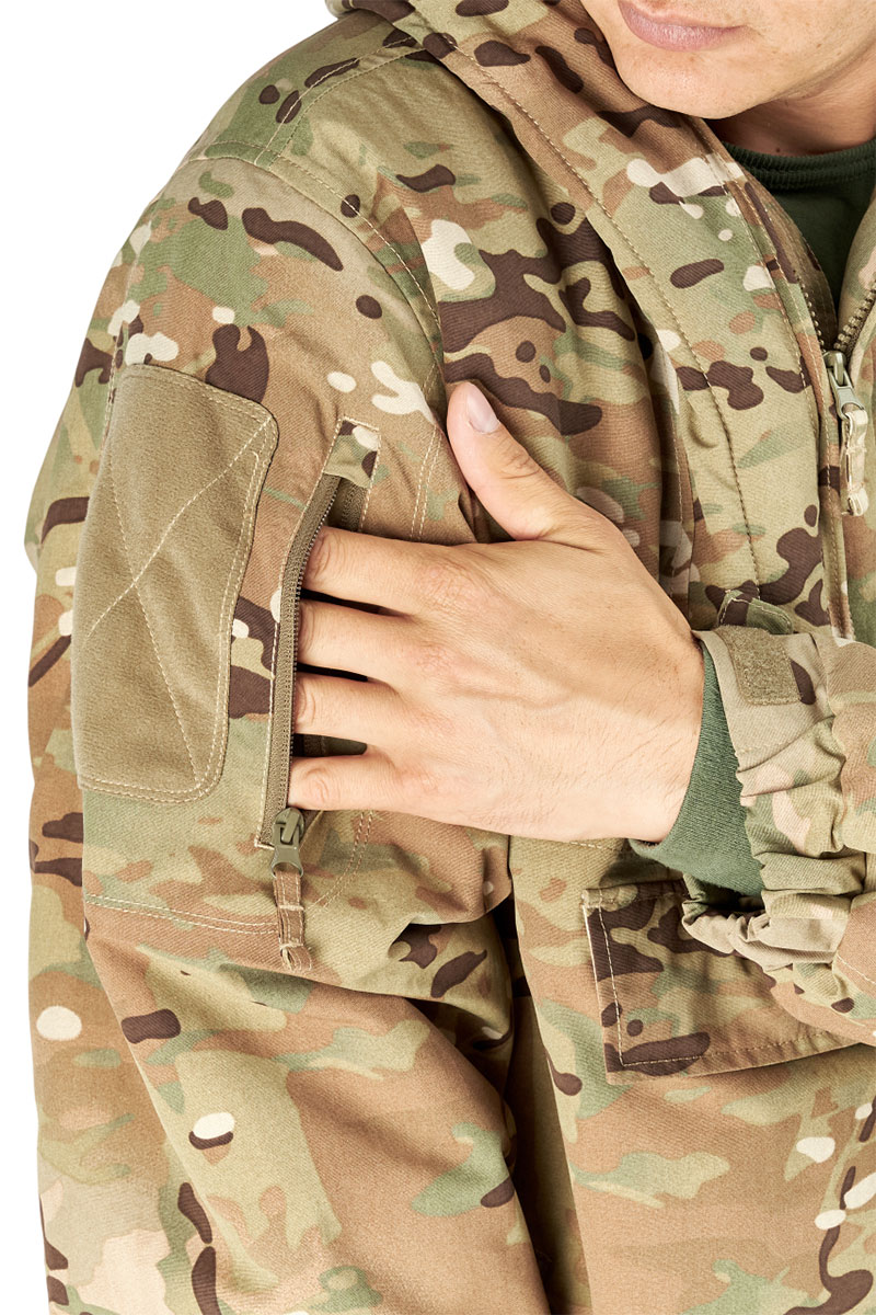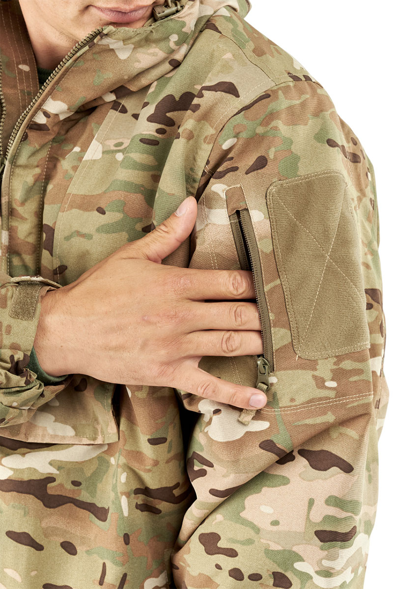 Боковые манжеты по низу куртки позволяют регулировать ширину куртки, обеспечивая идеальную посадку. Объемный нагрудный карман обеспечивает достаточное место для хранения необходимых предметов, а на каждом рукаве есть дополнительный карман для мелочей и велькро под шевроны на липучках.