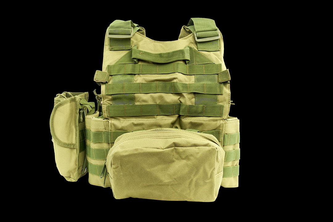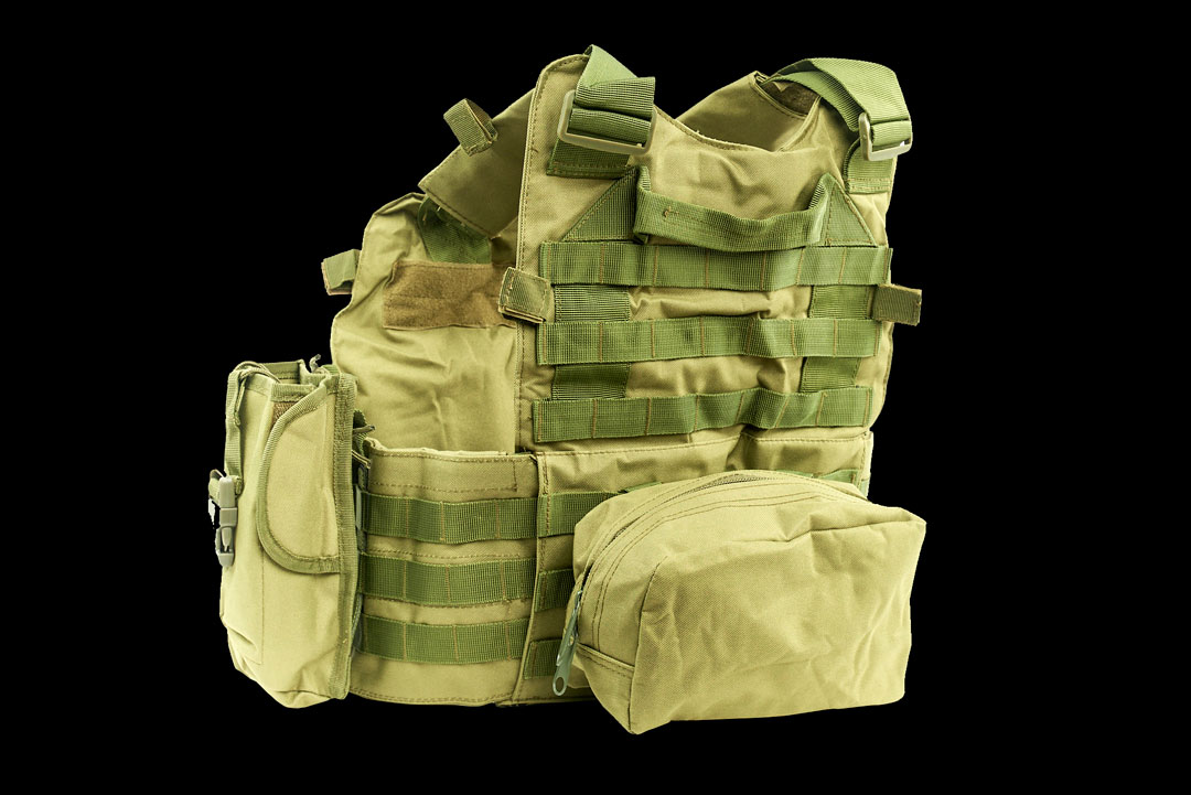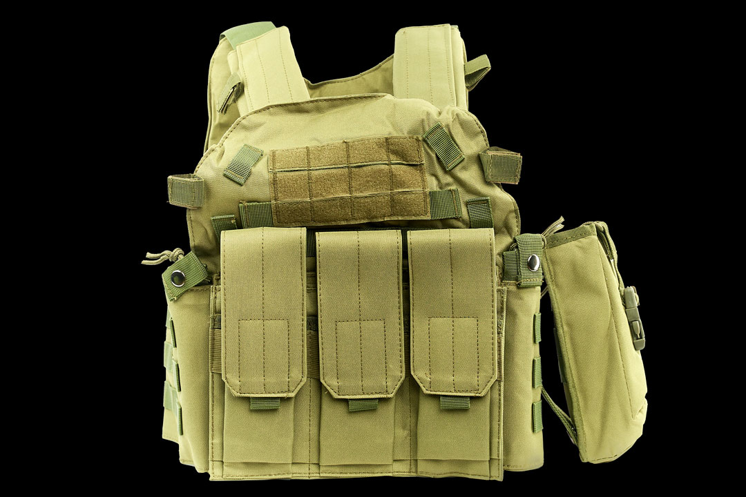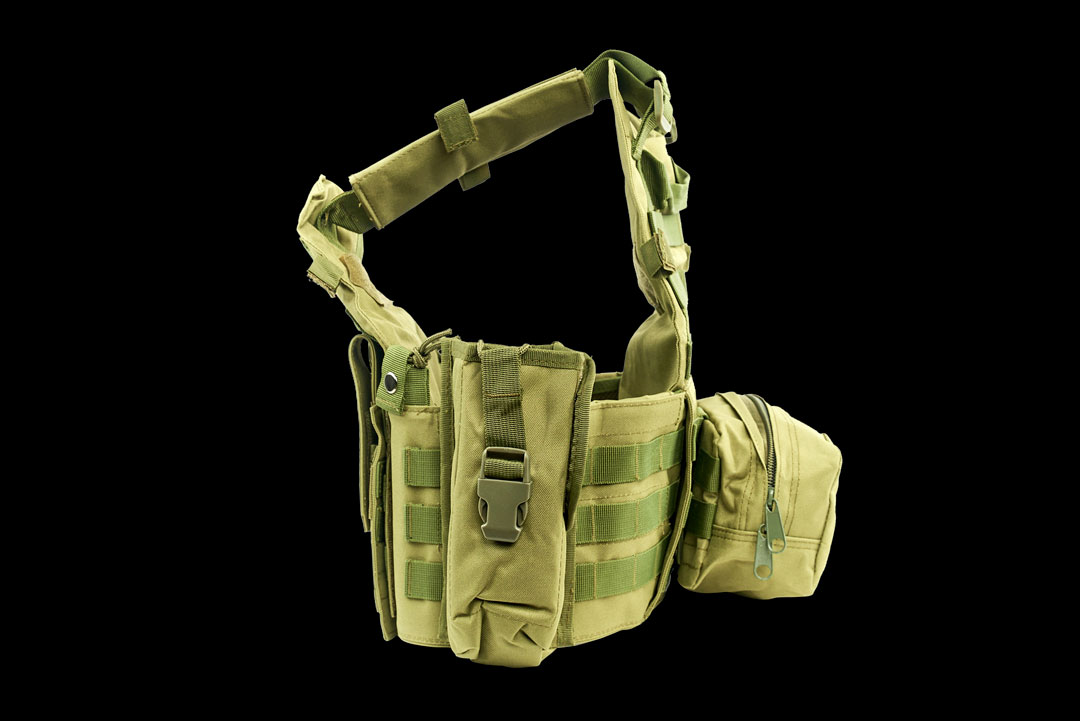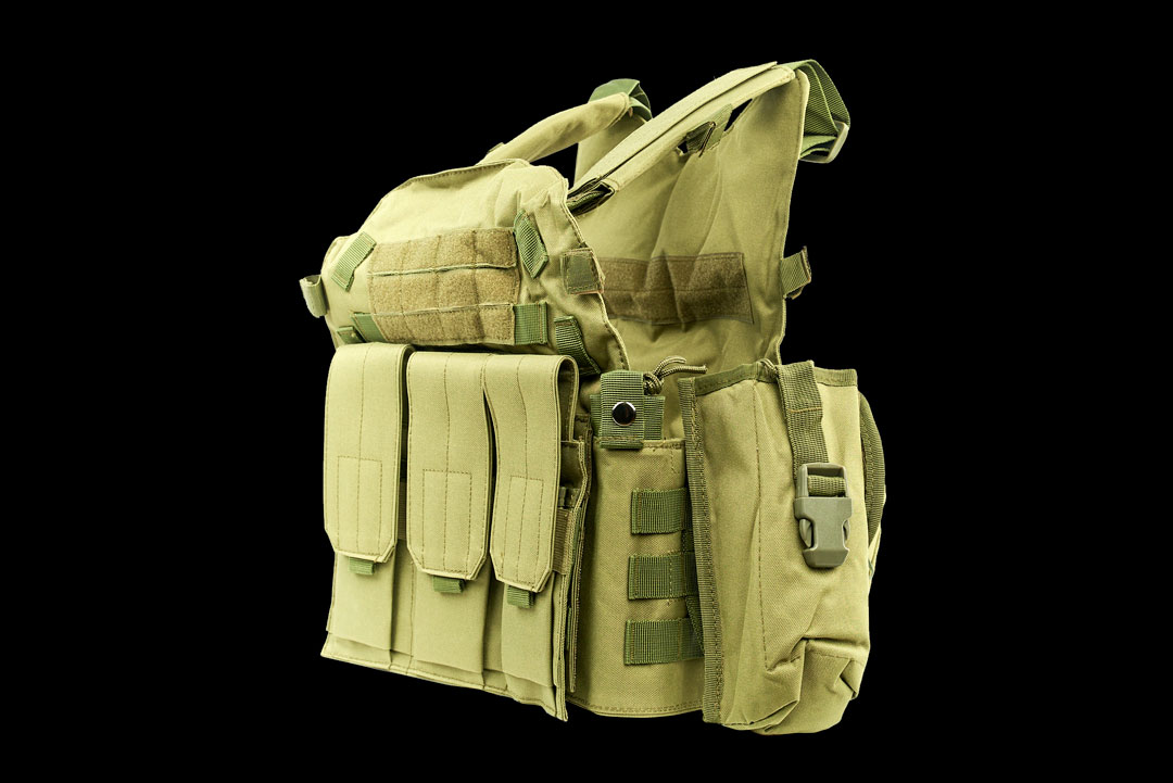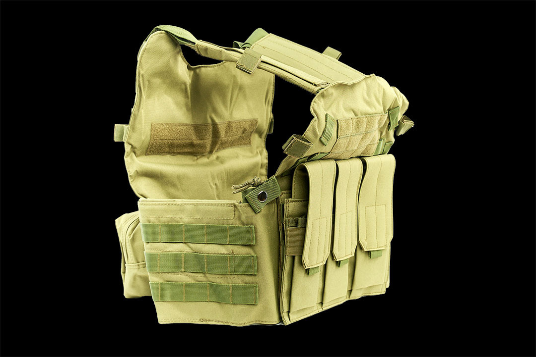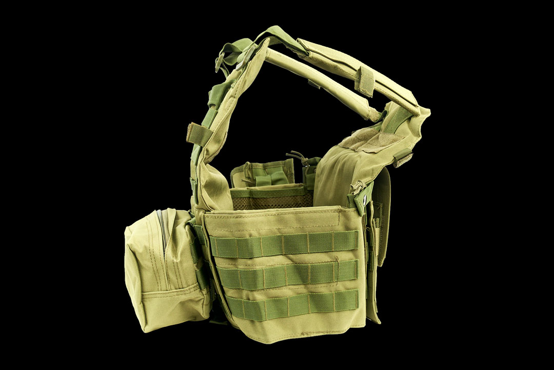 Cпереди и сзади жилета нашиты стропы «молле» для крепления подсумков.